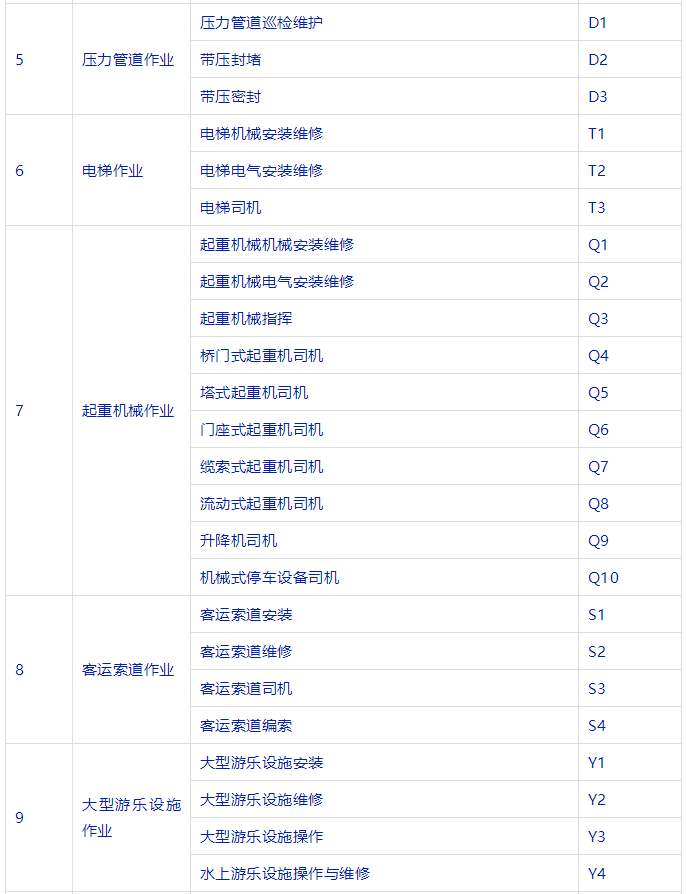 特種設(shè)備安全管理人員、叉車(chē)司機(jī)、起重機(jī)司機(jī)、起重機(jī)指揮、壓力容器、鍋爐、氣瓶充裝、電梯安裝與維修、觀(guān)光車(chē)、客運(yùn)索道操作與修理、大型游樂(lè)設(shè)施操作與維修等等。